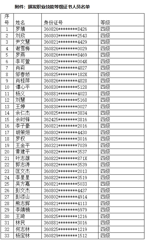 根據(jù)《江西省人力資源和社會保障廳關(guān)于遴選備案職業(yè)技能等級認(rèn)定社會培訓(xùn)評價組織的通知》(贛人社字(2020)302號)、(贛人社字(2022)128號)文件要求。按照《關(guān)于開展“互聯(lián)網(wǎng)+職業(yè)技能等級認(rèn)定”試點工作的通知》(贛人社字(2020)397號)精神。我校于2024年11月25日開展了電子商務(wù)師(網(wǎng)商)等級認(rèn)定,共37人(四級),通過認(rèn)定考核33人?,F(xiàn)對認(rèn)定考核合格人員進(jìn)行公示(名單附后)。