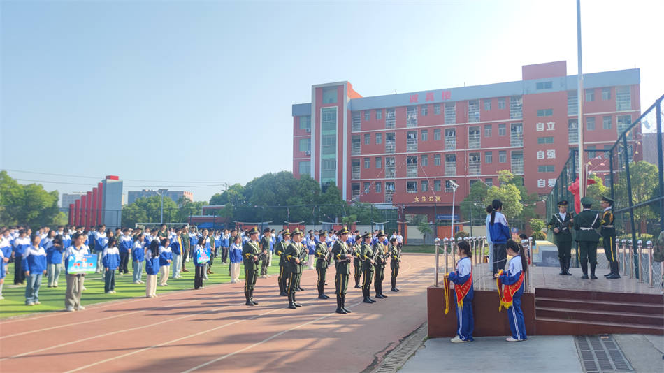 隨著激昂的入場音樂響起,師生們迅速有序地集合在操場。升旗儀式正式開始,護(hù)旗手們精神抖擻、步伐整齊,護(hù)衛(wèi)著五星紅旗邁向升旗臺。當(dāng)《義勇軍進(jìn)行曲》奏響,五星紅旗冉冉升起,全體師生莊嚴(yán)肅立,行注目禮,齊聲高唱國歌,歌聲嘹亮,愛國之情在每個(gè)人心中激蕩。