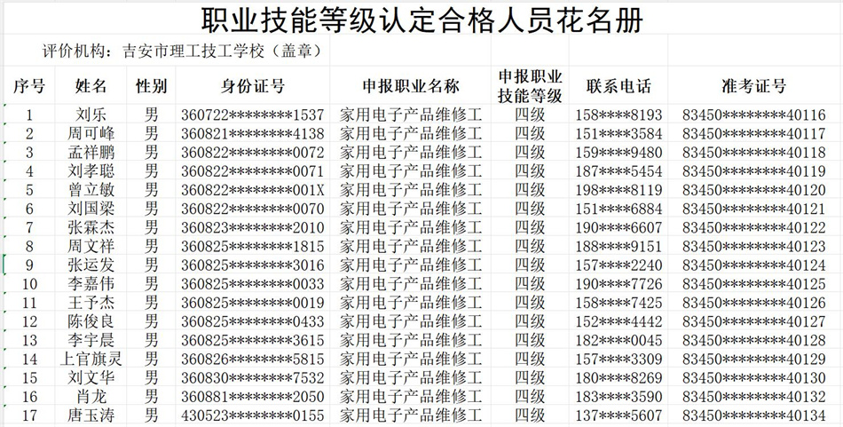 按照《贛人社規(guī)〔2022〕7號》文件精神。我校于2025年10月24日開展了家用電子產品維修工等級認定,共20人(四級),通過認定考核17人?,F對認定考核合格人員進行公示。(名單附后)