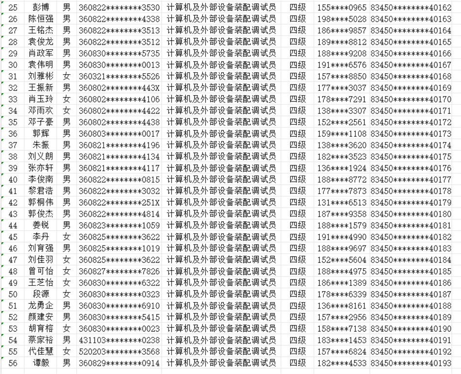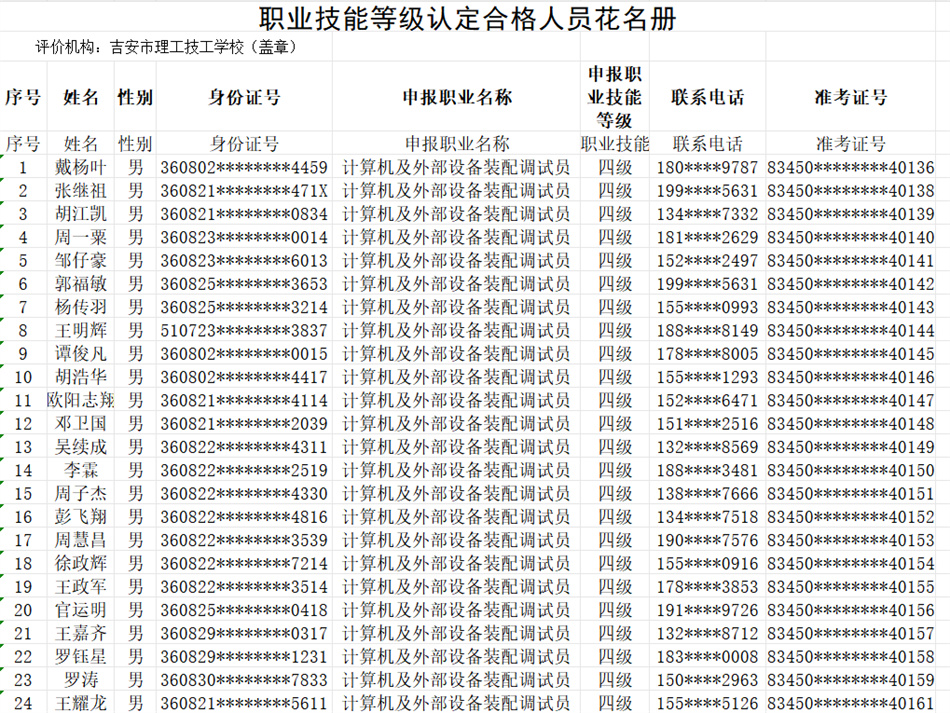 按照《贛人社規(guī)〔2022〕7號》文件精神。我校于2025年10月24日開展了計算機(jī)及外部設(shè)備裝配調(diào)試員(計算機(jī)整機(jī)裝配調(diào)試員)等級認(rèn)定,共58人(四級),通過認(rèn)定考核56人?,F(xiàn)對認(rèn)定考核合格人員進(jìn)行公示。(名單附后)