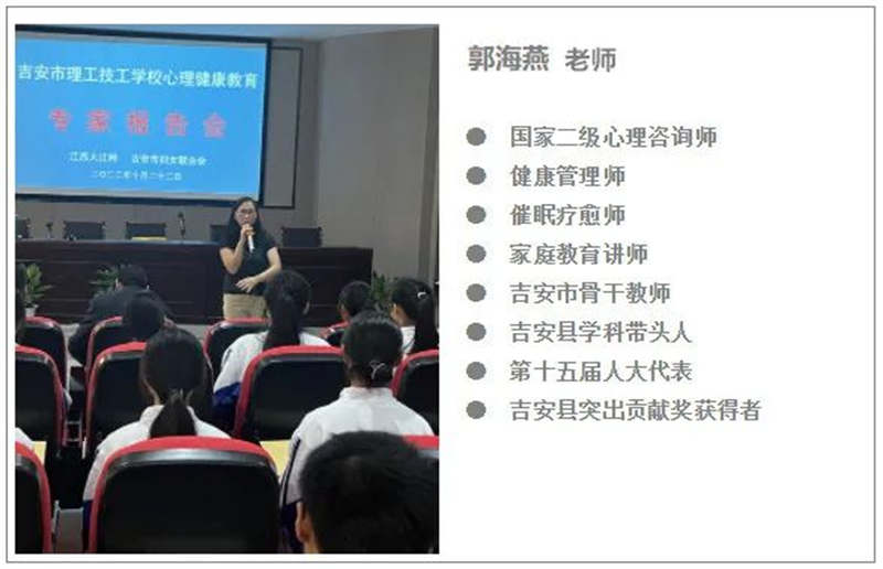 2022年10月22日,在我校多功能廳舉辦了吉安市理工技工學(xué)校心理健康教育專(zhuān)家報(bào)告會(huì)。會(huì)議由大江網(wǎng)和吉安市婦聯(lián)承辦,為表示對(duì)我校心理健康教育的關(guān)心,特邀郭海燕老師來(lái)我校作報(bào)告。