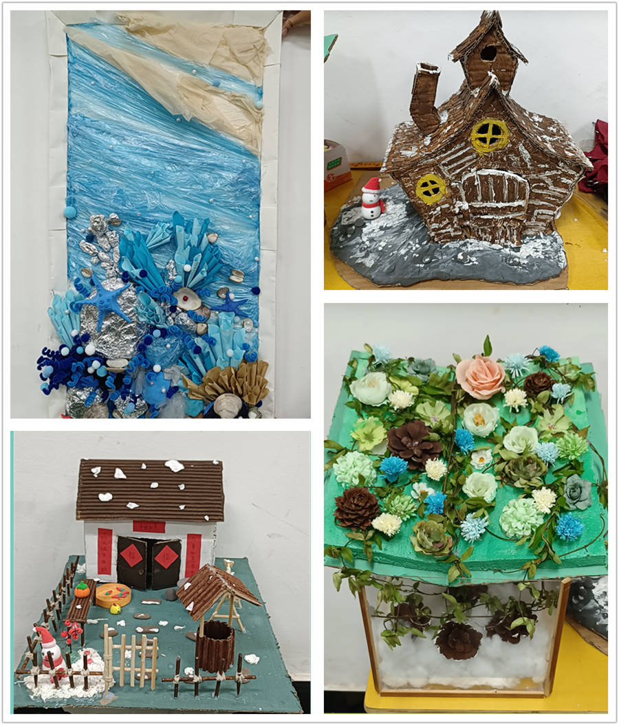 優(yōu)秀獎(jiǎng):歐陽昕手工作品《春之夢(mèng)--百花齊放》;周詩瑩、朱倩手工作品《四季與景》;曾雯萍、歐陽芊手工作品《冬日小屋》;李靜手工作品《落葉的季節(jié)》