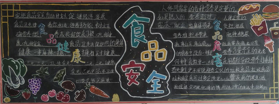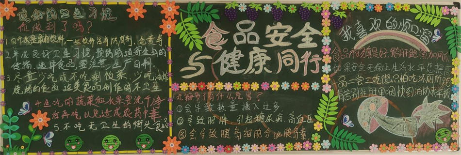 全國食品安全宣傳周活動,食品安全關(guān)乎每個人的健康,學生們以我學我寫,我能我畫的形式,一起制作了簡單又漂亮的食品安全宣傳周黑板報,學生們用心制作的食品安全黑板報,都寄托了學生呼吁食品安全的心聲,倡導食品安全,給我們一個健康的身體的心愿。
